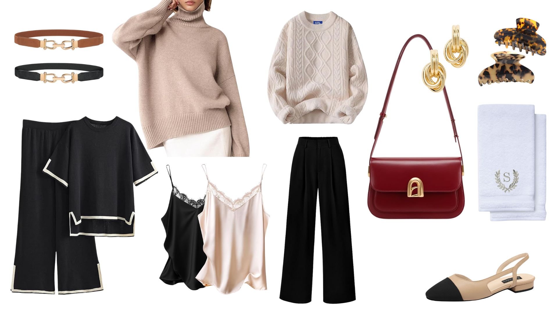 From Left to Right: Black and Camel Belts with Gold Buckles, Beige Turtleneck Sweater, Beige Knit Sweater, Cherry Red Leather Purse, Gold Earrings, Tortoise Claw Clips, Black and White Set, Silk and Lace Tank Tops in Black and Beige, Classic Black Trousers, Personalized Monogram Towels, Black and Beige Pointed Toe Sling Backs