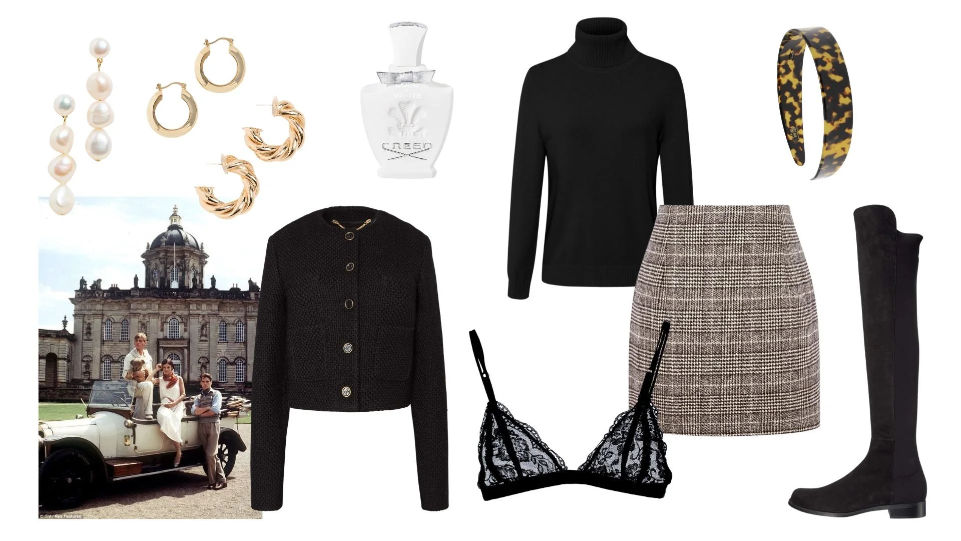 From Left to Right: Pearl Earrings, Classic Gold Hoops, Twisted Gold Hoops, Creed Perfume in Love In White, Black Turtleneck, Tortoise Headband, Black Tweed Jacket, Black Lace Bralette, Plaid Mini Skirt, Stuart Weitzman Women's Reserve Stretch Suede Boots