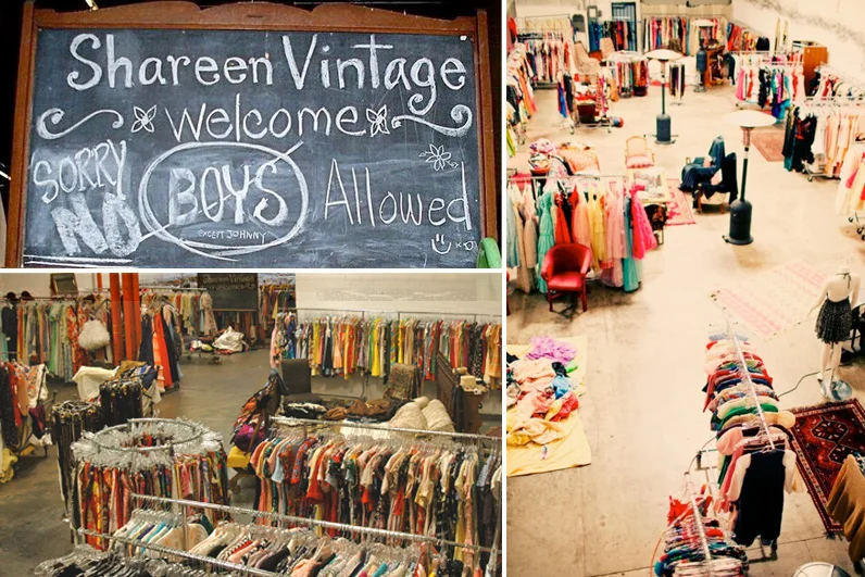 This isn't your typical vintage shopping experience. A trip to Shareen Vintage is more of an adventure to find fashion treasures. So gather up, bold fashionistas. The chest is buried just next to Downtown LA. You will have to keep your eyes peeled because there are no signs outside to indicate that a big red warehouse is where an empress of style resides. Abandon all ye' man friends before walking through the door. No boys allowed! There are no dressing rooms. Instead, what you will find is a huge warehouse, decorated as if it were a friend's bedroom with a bed, couch, full length mirrors...and racks and racks of vintage dresses.